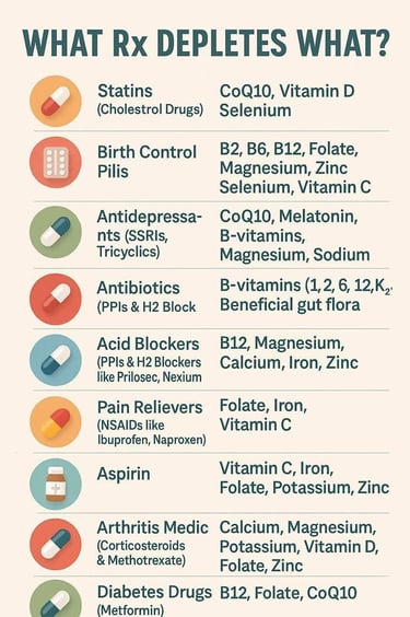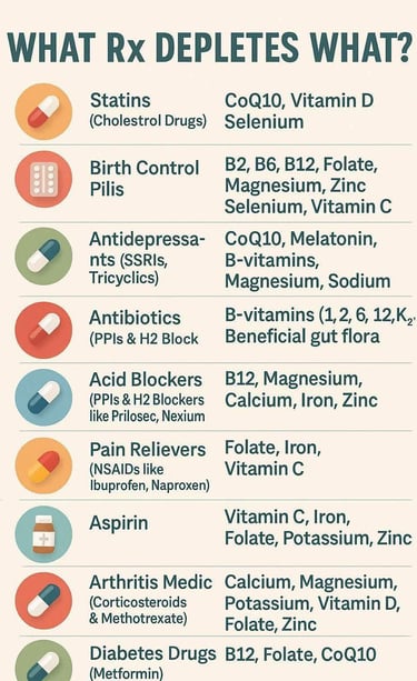 #DrugNutrientDepletion #MedicationAwareness #RxAndNutrition #DrugNutrientInteractions #NutrientDepletion #Micronutrients #CoQ10 #VitaminB12 #Magnesium #Folate #VitaminD #Zinc #GutHealth #Microbiome #EnergySupport #HormoneHealth #MentalWellness #HeartHealth #BoneHealth #HealthEducation #Statins #Metformin #BirthControl #SSRIs #PPIs #NSAIDs #Antibiotics #Aspirin #BloodPressureMeds #Corticosteroids #Methotrexate #IntegrativeHealth #FunctionalMedicine #DietAndSupplements